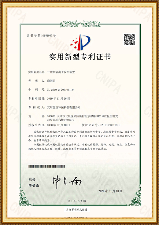 • 實用新型專利證書(一種負(fù)氧離子發(fā)生裝置)